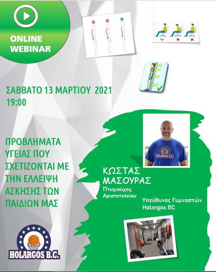 "Προβλήματα υγείας που σχετίζονται με την έλλειψη άσκησης των παιδιών μας" είναι το θέμα το οποίο θα αναπτυχθεί στο 3ο webinar -διαδικτυακή συζήτηση- που διοργανώνει ο HOLARGOS BC αυτό το Σάββατο 13 Μαρτίου και ώρα 19:00.