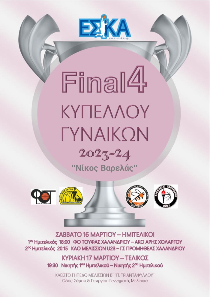 To Σαββατοκύριακο 16-17 Μαρτίου 2024 θα διεξαχθεί το Final Four του Κυπέλλου Γυναικών ΕΣΚΑ 2023-2024 “Νίκος Βαρελάς”, στο κλειστό γήπεδο Μελισσίων Β’ “Π. Τριανταφύλλου” (Σάμου & Γεωργίου Γεννηματά, Μελίσσια).