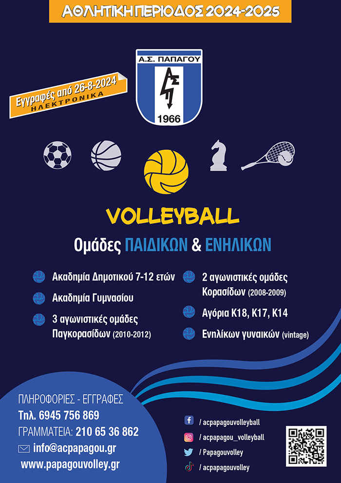 Ξεκίνησαν ήδη ηλεκτρονικά οι εγγραφές αλλά κι οι επανεγγραφές στο τμήμα βολεί του ΑΣ Παπάγου. Σε αυτή την κατεύθυνση, το τμήμα έχει αποκτήσει ένα νέο εργαλείο που θα συμβάλλει στην επικοινωνία και γενικότερα στην εξωστρέφειά του. Πρόκειται για την επίσημη ιστοσελίδα του, http://www.papagouvolley.gr. Σε αυτή υπάρχει πλήρης ενημέρωση για τη δραστηριότητα και την ταυτότητα του τμήματος.