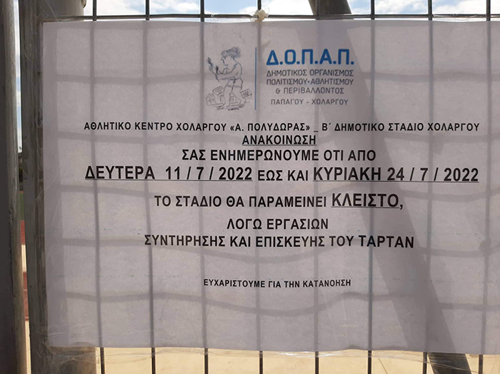 Ράβε ξήλωνε δουλειά να μην σου λείπει!... Για τρίτη φορά κλείνει το γήπεδο στο νταμάρι, ώστε να ξανά-επισκευαστεί. Πρώτα με το έργο διαμόρφωσης του που βγήκε, όπως όλα τα τελευταία έργα, εκτός χρονοδιαγραμμάτων δοκιμάζοντας αρκετά, τα αθλητικά σωματεία το 2019 που έμειναν εκτός έδρας.