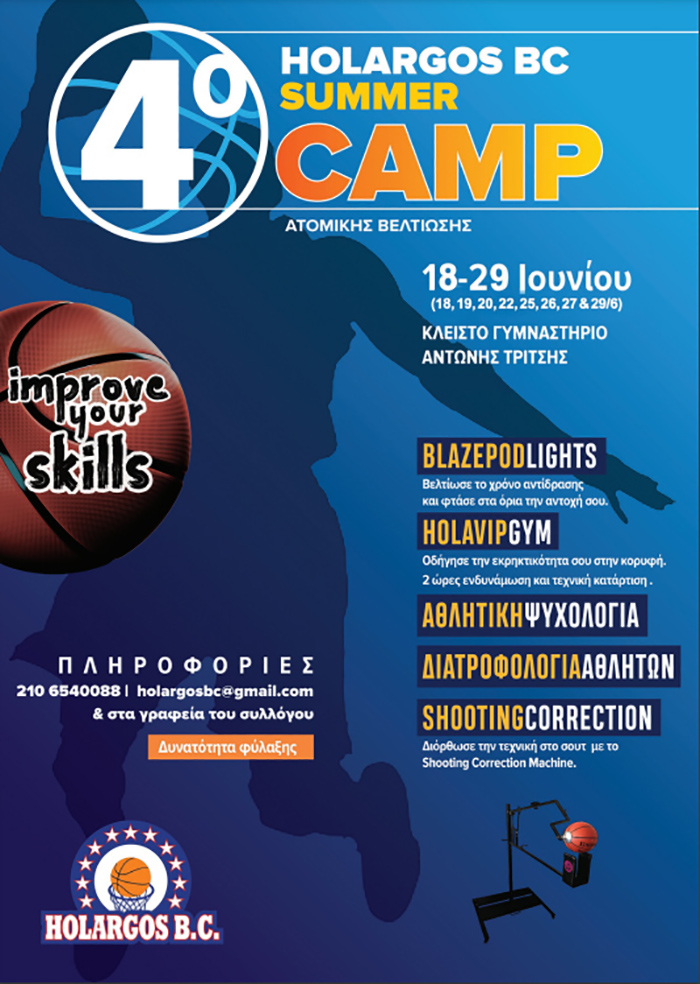 Αποκλειστικά και μόνο στο κλειστό Γυμναστήριο Χολαργού Αντώνης Τρίτσης, θα διενεργηθεί το φετινό 4ο “SUMMER BASKETBALL CAMP...improve your skills”, λόγω της έλλειψης κλιματισμού στο μπαλόνι.