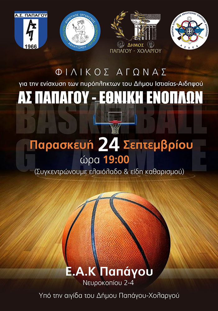 Ο Αθλητικός Σύλλογος Παπάγου Papagou A.C. - Α.Σ. Παπάγου και η Εθνική Ομάδα Ενόπλων, σας καλούν σε φιλικό αγώνα Basket ο οποίος διοργανώνεται υπό την αιγίδα του Δήμου Παπάγου – Χολαργού και του Δημοτικού Οργανισμού Αθλητισμού και Περιβάλλοντος, για τη στήριξη των πυρόπληκτων του Δήμοι Ιστιαίας - Αιδηψού.