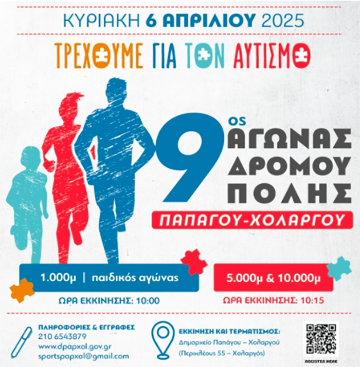 Ο Δήμος Παπάγου-Χολαργού σε συνεργασία με τον Καλαθοσφαιρικό Όμιλο Χολαργού (Κ.Ο.Χ.), προκηρύσσουν τον «9ο Αγώνα Δρόμου Πόλης Παπάγου-Χολαργού - Τρέχουμε για τον Αυτισμό», την Κυριακή 6 Απριλίου 2025.