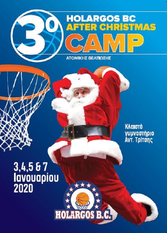 Η Αθλητική Ένωση Χολαργού ανακοινώνει την διενέργεια του 3ου Holargos BC After Christmas Basket Camp που θα πραγματοποιηθεί στο κλειστό γυμναστήριο Χολαργού "Αντ. Τρίτσης" στις 3, 4, 5 & 7 Ιανουαρίου 2020. Στο πλαίσιο του καμπ οι αθλητές θα εξασκηθούν στο σουτ με το κορυφαίο μηχάνημα το Dr. Dish