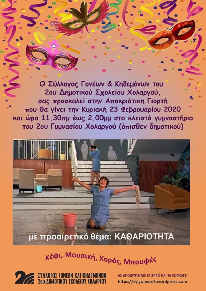Την Κυριακή 23 Φεβρουαρίου καλεί ο Σύλλογος Γονέων του 2ου Δημοτικού Σχολείου Χολαργού, αυτή τη φορά όχι σε κινητοποίηση, αλλά σε πάρτυ μασκέ με προαιρετικό θέμα όπως λένε και στην αφίσα τους... την καθαριότητα!