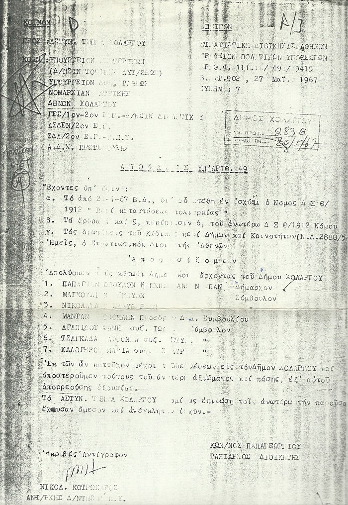 Στις φωτογραφίες ο Παναγιώτης Παπαγιάννης σε μία από τις ομιλίες του στον Δήμο Χολαργού και το έγγραφο της Χούντας προς το Αστυνομικό Τμήμα Χολαργού 30/5/1967 με το οποίο «απολύονται» ο Δήμαρχος και το Δημοτικό Συμβούλιο του Δήμου Χολαργού.