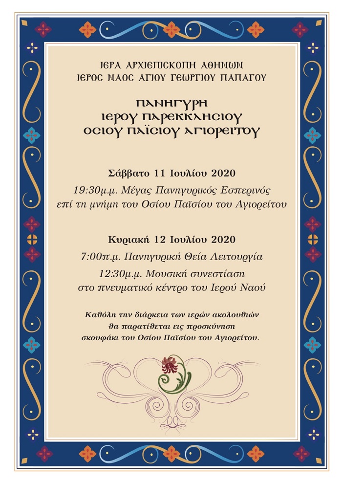Tο Σάββατο 11 και την Κυριακή 12 Ιουλίου 2020 στo πλαίσιo της πανηγύρεως του Ιερού Παρεκκλησίου Οσίου Παϊσίου Αγιορείτου θα πραγματοποιηθούν ακολουθίες και άλλες δραστηριότητες στον Άγιο Γεώργιο Παπάγου, σύμφωνα με το πρόγραμμα που ακολουθεί: