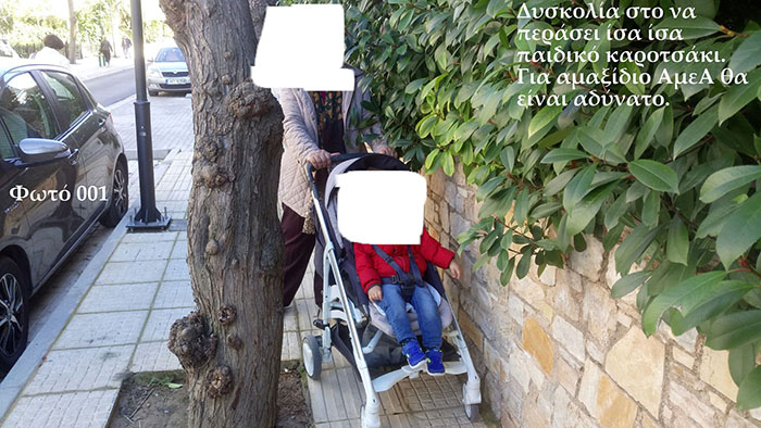 Με έλλειψη σεβασμού προς τους ΑμεΑ συμπολίτες μας που σε αρκετά σημεία δεν μπορούν να χρησιμοποιήσουν το πεζοδρόμιο με τα αναπηρικά αμαξίδια και σε μήκος ολόκληρου οικοδομικού τετραγώνου δεν υπάρχουν διαδρομές για τυφλούς. Φωτό 001.