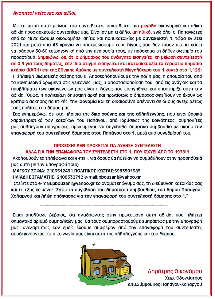 Συλλέγουν υπογραφές οι Παπαγιώτες για το Δημοτικό Συμβούλιο με θέμα το συντελεστή δόμησης
