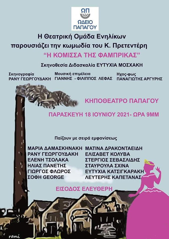 Την κλασική κωμωδία του Κώστα Πρετεντέρη ''Η ΚΟΜΙΣΣΑ ΤΗΣ ΦΑΜΠΡΙΚΑΣ'' θα παρουσιάσει η θεατρική ομάδα του Ωδείου Παπάγου την Παρασκευή 18/6/2021 στις 9μμ στο Κηποθέατρο Παπάγου.
