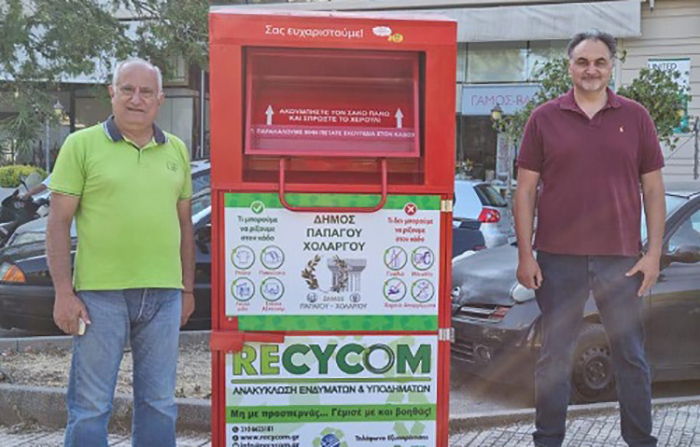 Κόκκινοι κάδοι ανακύκλωσης ρούχων και υποδημάτων τοποθετήθηκαν σε πέντε σημεία του Δήμου Παπάγου – Χολαργού, 2 στην Κοινότητα Παπάγου και 3 στην Κοινότητα Χολαργού, μετά από τις συντονισμένες ενέργειες των Αντιδημάρχων κ.κ. Μιχάλη Υφαντή και Χρήστου Πετράκη, καθώς και του π. Αντιδημάρχου Βασίλη Σιαμάνη.