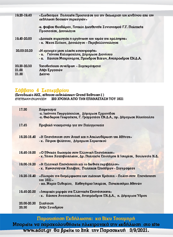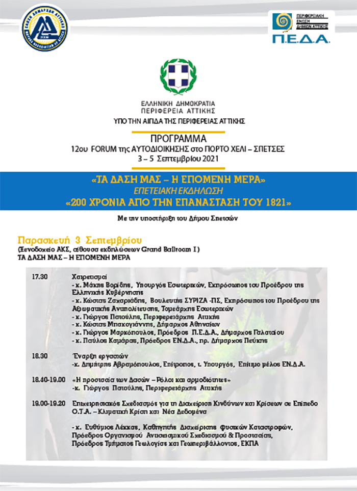 Το 12ο ΦΟΡΟΥΜ της ΑΥΤΟΔΙΟΙΚΗΣΗΣ διοργανώνεται από την Ένωση Δημάρχων και την ΠΕΔΑ με την αιγίδα της Περιφέρειας Αττικής με θέμα: "Τα Δάση μας - Η επόμενη μέρα" στο Πόρτο Χέλι στις 3-5 Σεπτεμβρίου 2021.