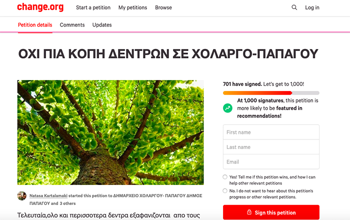 Μπορείτε να συμμετέχετε εδώ: https://www.change.org/p/δημοσ-παπαγου-οχι-πια-κοπη-δεντρων-σε-χολαργο-παπαγου?recruiter=false&utm_source=share_petition&utm_medium=facebook&utm_campaign=psf_combo_share_initial&utm_term=psf_combo_share_initial&recruited_by_id=717e83d0-2e54-11ec-9e88-69aa462b325b&utm_content=fht-22858323-en-us%3A0