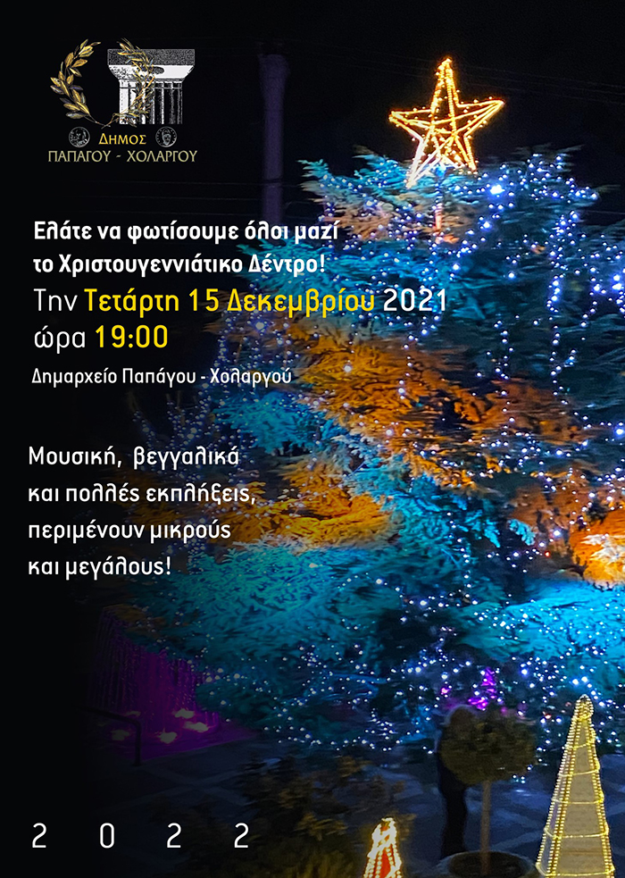 Την Τετάρτη 15 Δεκεμβρίου στις 19:00, σε μια βραδιά γεμάτη εκπλήξεις και Χριστουγεννιάτικες μελωδίες, από την Παιδική Χορωδία του Δήμου και τον Αντώνη Δόμινο ο Δήμος Παπάγου Χολαργού φωτίζει το Χριστουγεννιάτικο Δέντρο της πόλης.