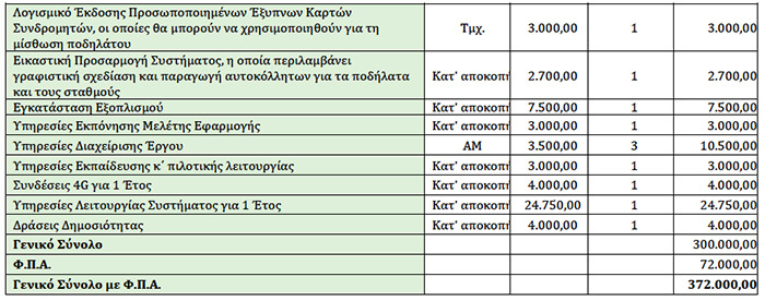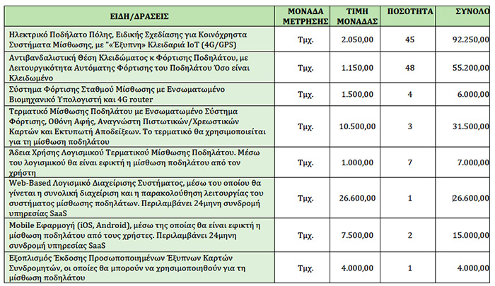 Συγκεκριμένα, στην πρόταση περιλαμβάνεται η προμήθεια 45 ηλεκτρικών ποδηλάτων, 48 θέσεις κλειδώματος/φόρτισης, λογισμικό για προσωποποιημένες κάρτες, για τη διαχείριση λειτουργίας του συστήματος, για το σύστημα μίσθωσης κ.ά. Η διάρκεια της σύμβασης ορίζεται στα 2 χρόνια από την υπογραφή της οπότε και θα ολοκληρωθεί η προμήθεια και εγκατάσταση. Το συνολικό κόστος του προγράμματος προβλέπεται να φτάσει τα 372.000 ευρώ.
