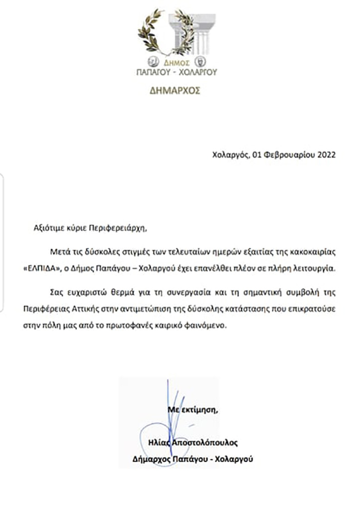 Ευχαριστήρια επιστολή έστειλε ο Δήμαρχος Παπάγου Χολαργού στον Περιφερειάρχη Αττικής Γ. Πατούλη για τη βοήθεια της Περιφέρειας στις δράσεις αποχιονισμού λόγω της χιονοκαταιγίδας "ΕΛΠΙΔΑ".
