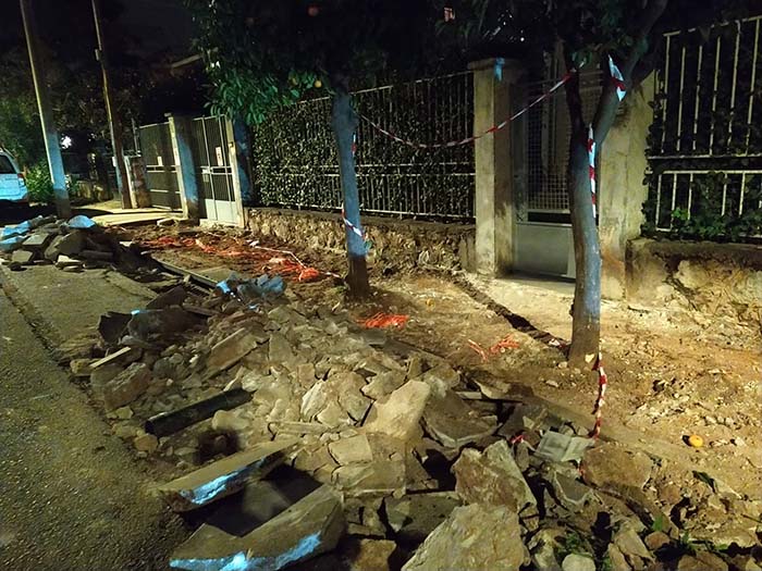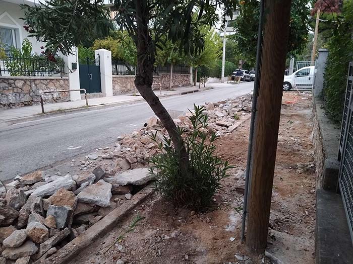 Εκεί εκτελούνται έργα επιδιόρθωσης πεζοδρομίων του ίδιου του Δήμου. Και ο εργολάβος βρήκε βολικό, όπως φαίνεται να πετάξει τα μπάζα μέσα στο δρόμο, δημιουργώντας ένα σημείο που εμποδίζει, παρά τις ρητές προβλέψεις του νόμου, την διέλευση των πεζών και να θέτει σε κίνδυνο την οδική ασφάλεια των διερχόμενων οχημάτων.