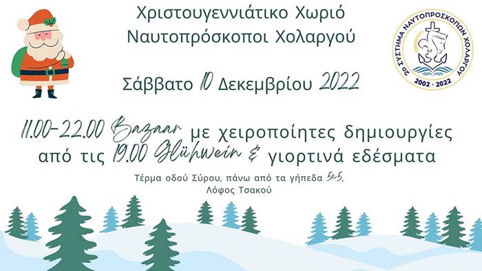 Ξεκίνησε η αντίστροφη μέτρηση για το Χριστουγεννιάτικο Χωριό του 2ου Συστήματος Ναυτοπροσκοπών Χολαργού! Το Σάββατο 10 Δεκεμβρίου 2022 από τις 11 το πρωί ανοίγει η μεγάλη ξύλινη πόρτα της λέσχης στον Τσακό και θα μείνει ανοιχτή για όλους μέχρι αργά το βράδυ.