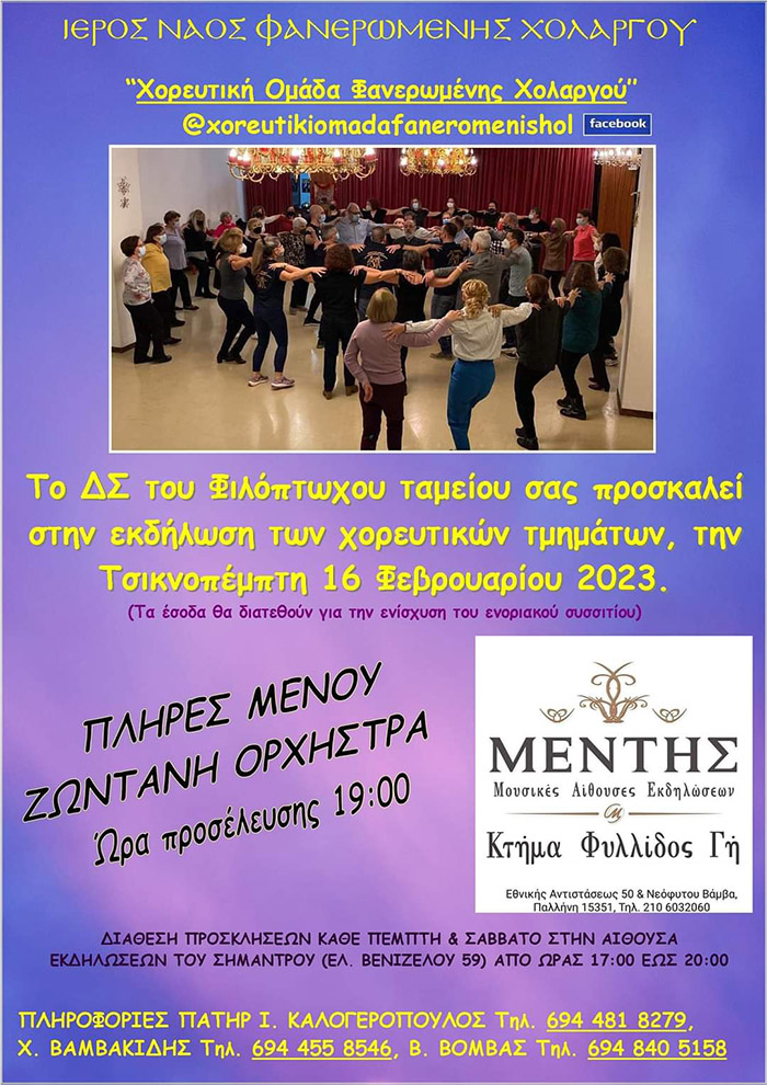 Για την ενίσχυση του Ενοριακού συσσιτίου διοργανώνεται εκδήλωση από τα χορευτικά τμήματα του Ι.Ν. Φανερωμένης Χολαργού την Τσικνοπέμπτη 16 Φεβρουαρίου 2023.