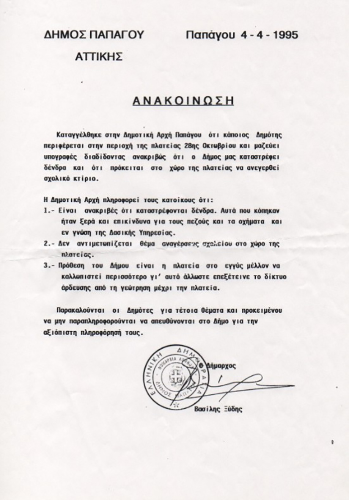 Στις 04/04/1995, εκδόθηκε ανακοίνωση του τότε Δημάρχου κ. Β. Ξύδη (βλ. φωτό), εξαιτίας της συγκέντρωσης υπογραφών από δημότη της περιοχής για την κοπή δένδρων στην πλατεία (Ο.Τ. 338α) προκειμένου να ανεγερθεί σχολικό συγκρότημα.