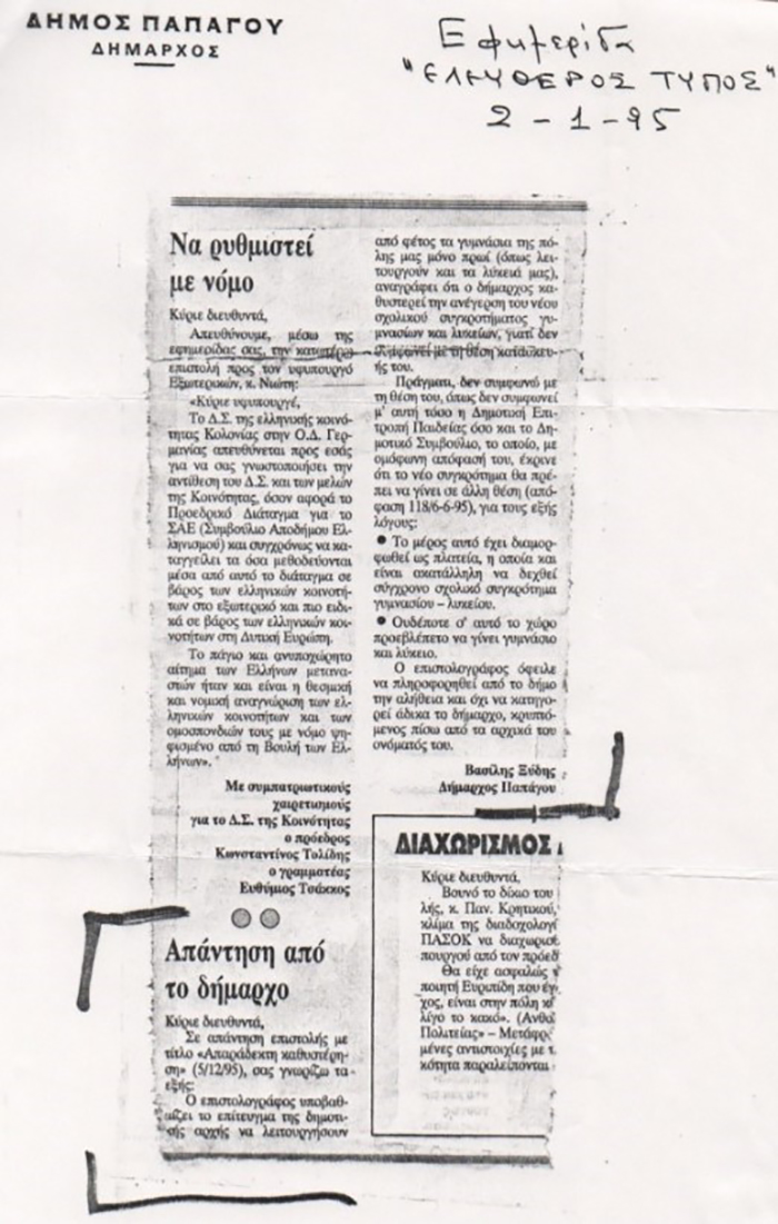 Ο κ. Β. Ξύδης απάντησε στο δημοσίευμα (βλ. φωτό) επιβεβαιώνοντας τη διαφωνία του και επικαλούμενος και τη διαφωνία της Δημοτικής Επιτροπής Παιδείας, καθώς και την υπ’ αριθμόν 118/06.06.1995 ομόφωνη απόφαση του Δημοτικού Συμβουλίου Παπάγου, το οποίο «έκρινε ότι το νέο συγκρότημα θα πρέπει να γίνει σε άλλη θέση».