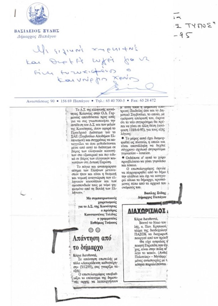 Φωτοτυπία του δημοσιεύματος με την απάντηση/δήλωση του τότε Δημάρχου, σε επιστολόχαρτο με το λογότυπο του Δήμου Παπάγου, εστάλη τότε στους κατοίκους της περιοχής “with the Compliments…” του τότε Δημάρχου…!!!