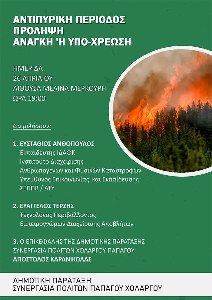 Η Δημοτική Παράταξη ΣΥΝΕΡΓΑΣΙΑ ΠΟΛΙΤΩΝ ΠΑΠΑΓΟΥ ΧΟΛΑΡΓΟΥ διοργανώνει ημερίδα την Παρασκευή 26 Απριλίου στην αίθουσα "Μελίνα Μερκούρη" του Δημαρχείου Παπάγου-Χολαργού (Λεωφόρος Περικλέους 55, Χολαργός) και ώρα 19:00, με τίτλο: "Αντιπυρική περίοδος. Πρόληψη Ανάγκη ή Υπο-χρέωση;"