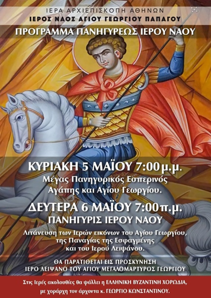 Διήμερος εορτασμός στον Ιερό Ναό Αγίου Γεωργίου Παπάγου με τον Μέγα Εσπερινό ανήμερα το Πάσχα Κυριακή (5/5) στις 19.00 μ.μ. και την Δευτέρα (6/5) στις 19.00 μμ με τη Λιτάνευση των Ιερών Εικόνων Αγίου Γεωργίου, Παναγίας Εσφαγμένης και Ιερού Λειψάνου.