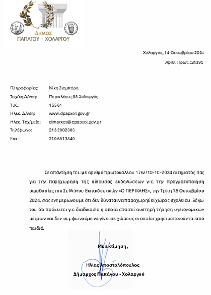 Συγκεκριμένα στο αίτημα του Συλλόγου μας για παραχώρηση της αίθουσας εκδηλώσεων του 1ουΔημοτικού Σχολείου Χολαργού προκειμένου να πραγματοποιηθεί εθελοντική αιμοδοσία των μελών του Συλλόγου Εκπαιδευτικών Π.Ε. «Ο ΠΕΡΙΚΛΗΣ » ο Δήμαρχος Παπάγου Χολαργού με έγγραφό του (το οποίο επισυνάπτουμε) αρνήθηκε την παραχώρηση του χώρου προφασιζόμενος ότι «πρόκειται για διαδικασία η οποία απαιτεί αυστηρή τήρηση υγειονομικών μέτρων και δεν συμφωνούμε να γίνει σε χώρους οι οποίοι χρησιμοποιούνται από παιδιά»!