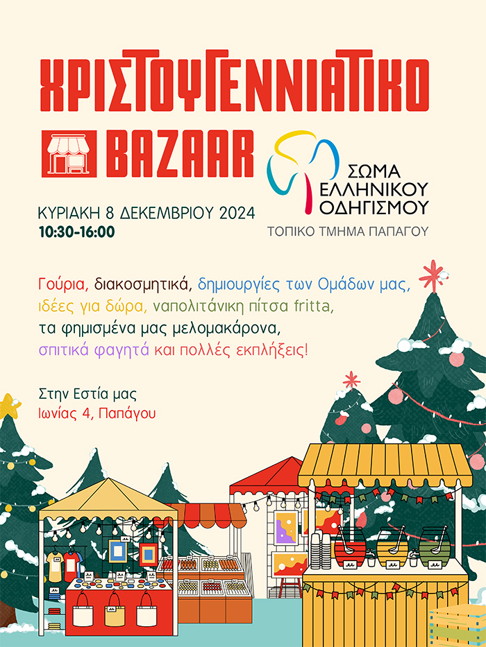 To Τοπικό Τμήμα Οδηγών Παπάγου καλεί όλους στο Χριστουγεννιάτικο Bazaar που θα γίνει την Κυριακή 8 Δεκεμβρίου στην Εστία του τμήματος, Ιωνίας 4, Παπάγου, από τις 10:30 έως τις 16:00.