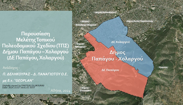 Η παρουσίαση θα πραγματοποιηθεί ααπό την Ανάδοχο Εταιρεία Π.ΔΕΛΗΚΟΥΡΑΣ - Δ.ΠΑΝΑΓΙΩΤΟΥ ΟΕ με δ.τ. “GEOPLAN”, στην Αίθουσα του Δημοτικού Συμβουλίου (Λ. Περικλέους 55 Χολαργός, 1ος όροφος).