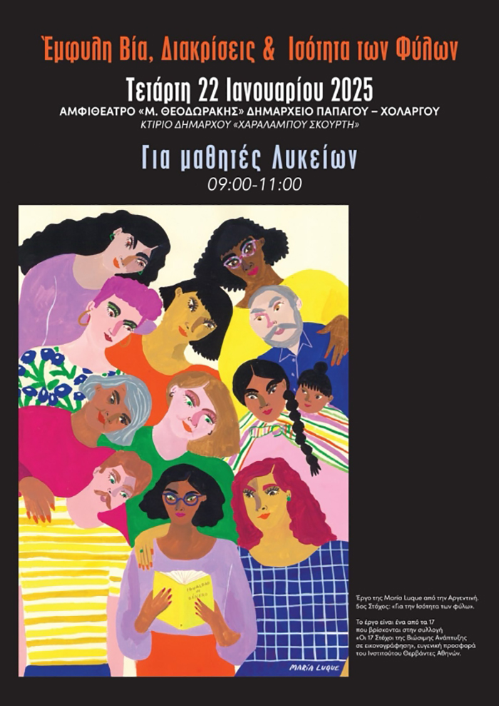 Ο Δήμος Παπάγου-Χολαργού στο πλαίσιο της κοινωνικής πολιτικής του, της πολιτικής Ισότητας των Φύλων και της προτεραιότητας του, στην ευαισθητοποίηση και ενημέρωση κυρίως των νέων για σχετικά θέματα, πάντα σε συνεργασία με την Επιτροπή Ισότητας του Δ.Σ. διοργανώνει εκδήλωση, σε συνεργασία με το Κέντρο Ερευνών για θέματα Ισότητας (ΚΕΘΙ) με θέμα: «Έμφυλη Βία, Διακρίσεις και Ισότητα των Φύλων».