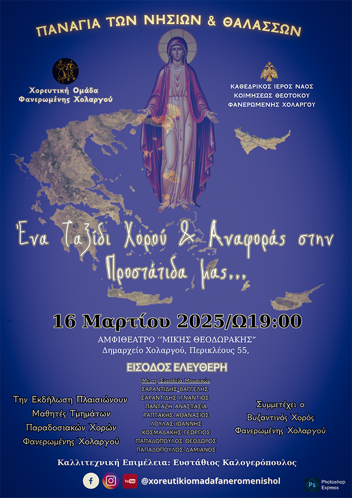Σε ένα χορευτικό ταξίδι με οδηγό την Παναγία, στα νησιά της Πατρίδος μας και όχι μόνο καλεί όλους η Χορευτική Ομάδα Ιερού Ναού Παναγίας Φανερωμένης Χολαργού.