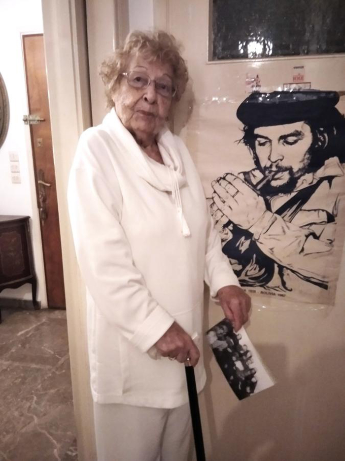 Έχει να βγει από το σπίτι μήνες επειδή οι δυνάμεις της την εγκαταλείπουν. Αυτή που έζησε αεικίνητη σε μια πολύβουη οικογένεια, με 6 αδέλφια, που «όργωσε» τα κρατητήρια, τις φυλακές και τις εξορίες από την εφηβεία της, που έθαψε αδέλφια, που είδε κομμένα κεφάλια αριστερών να τα περιφέρουν στις πλατείες, που φρόντισε αδέλφια και ανίψια, που συμμετείχε σε διαδηλώσεις και κινητοποιήσεις περιποιημένη πάντα στην τρίχα και με γοβάκι, σήμερα έχει συντροφιά το ραδιοφωνάκι -κολλημένο στους 105,5 στο Κόκκινο, τις ασπρόμαυρες φωτογραφίες των μελών της οικογένειάς της και το βλέμμα του Τσε που μας «παρακολουθούσε», όσο εμείς συζητούσαμε. Και δηλώνει αμετανόητη για τη ζωή της, που είναι η τραγωδία της σύγχρονης Ελλάδας.