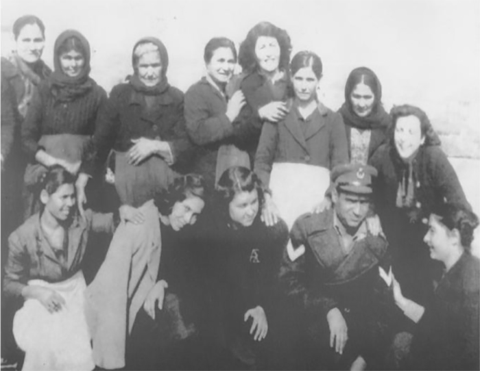 Μερικές από τις κρατούμενες στην ταράτσα του καπνομάγαζου με τον Κρητικό χωροφύλακα. Δίπλα του δεξιά η Ντόρα. Όλες κατέληξαν μαζί στην Μακρόνησο.