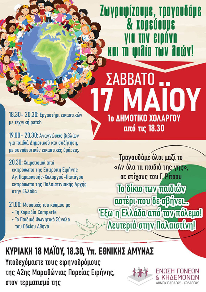 Φέτος επαναλαμβάνουμε το μήνυμά μας, τυλίγοντας σφιχτά το γαϊτανάκι της Ειρήνης, δηλώνοντας ότι δεν κλείνουμε τα μάτια στα γεγονότα στην Παλαιστίνη, στο έγκλημα ενάντια σε έναν λαό και τα χιλιάδες παιδιά του. Έτσι προχωρούμε στην εκδήλωση το Σάββατο 17 Μαΐου στο 1ο Δημοτικό Χολαργού και ώρα 18.30 με τίτλο: