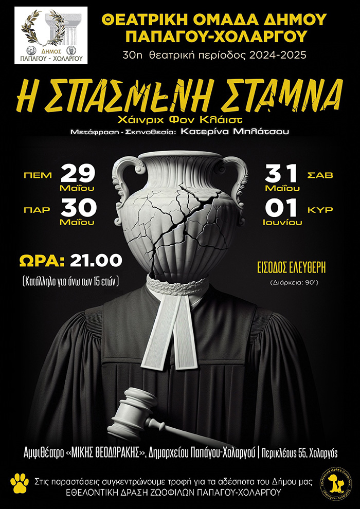 Ολοκληρώνεται και η φετινή επιτυχημένη θεατρική χρονιά για τη Θεατρική Ομάδα του Δήμου Παπάγου Χολαργού με την παράσταση "Η Σπασμένη Στάμνα" του Χάινριχ Φον Κλάιστ σε ένα γεμάτο 4ήμερο τις προσεχείς ημέρες Πέμπτη 29/5, Παρασκευή 30/5, Σάββατο 31/5 & Κυριακή 1/6.