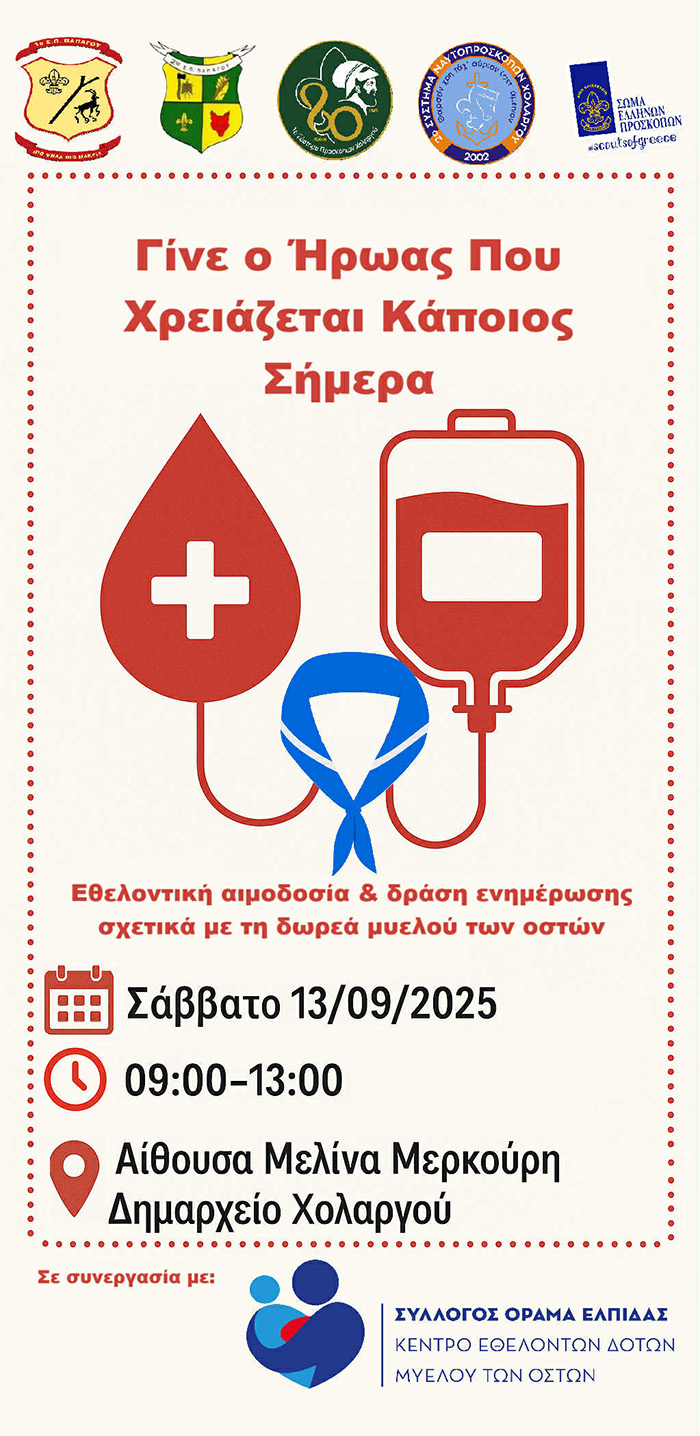 Κοινή δράση εθελοντικής αιμοδοσίας διοργανώνουν το Σάββατο 13 Σεπτεμβρίου 2025, από τις 09:00 έως τις 13:00, στην αίθουσα “Μελίνα Μερκούρη” του Δημαρχείου Παπάγου-Χολαργού, σε συνεργασία με το Νοσοκομείο "Γ. Γεννηματάς" όλα τα Συστήματα Προσκόπων της πόλης.