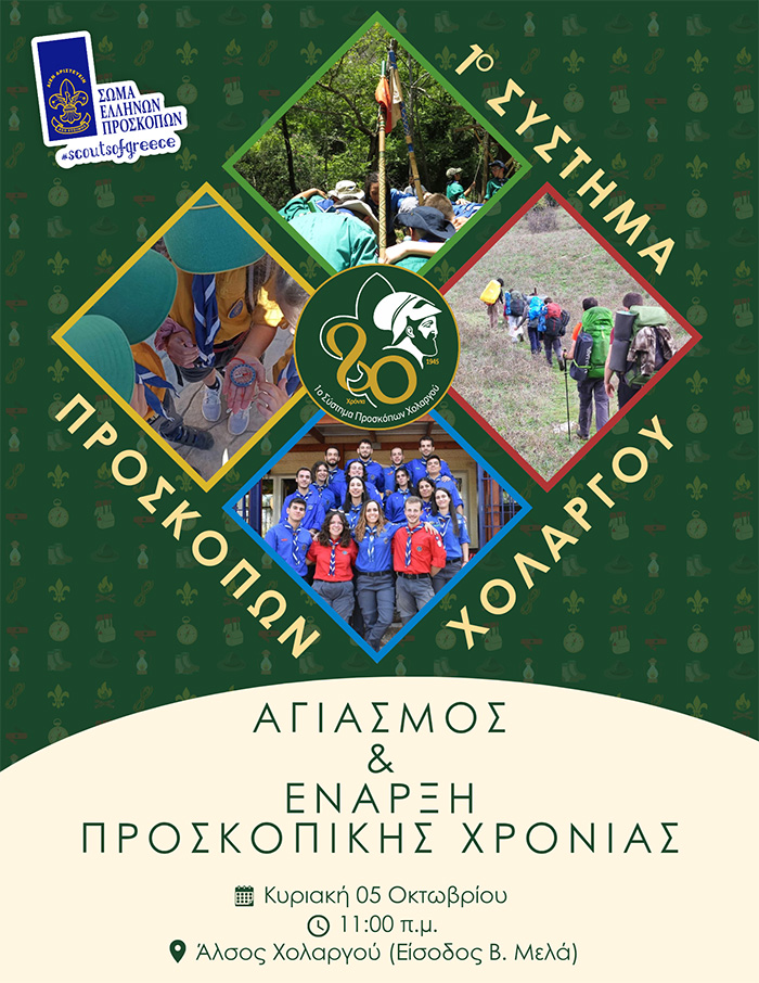 Ο Αγιασμός του 1ου Συστήματος Προσκόπων Χολαργού, θα πραγματοποιηθεί την Κυριακή 5 Οκτωβρίου 2025, στις 11:00 π.μ., στην εστία, εντός του Άλσους Χολαργού (ώρα προσέλευσης 10:45).