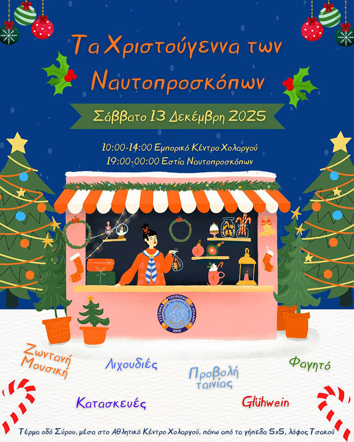 Από τις 10:00 έως τις 14:00, έξω από το εμπορικό κέντρο Χολαργού, στην οδό Περικλέους, σας περιμένει ένα πολύχρωμο σκηνικό με χειροποίητες κατασκευές, πρωτότυπα δωράκια και πολλές εκπλήξεις. Είναι η τέλεια ευκαιρία να κάνετε τις χριστουγεννιάτικες αγορές σας και ταυτόχρονα να στηρίξετε το Σύστημα Ναυτοπροσκόπων της περιοχής.