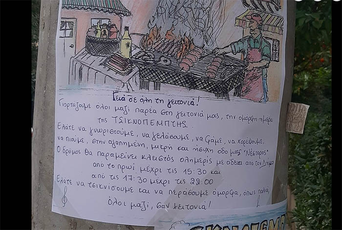 Ένα κάλεσμα που ξάφνιασε αναρτήθηκε στις κολώνες της γειτονιάς της οδού Νέστορος στο Χολαργό. Μία όμορφα επιμελημένη αφίσα απηύθυνε κάλεσμα σε όλους τους γείτονες, να συναντηθούν στο δρόμο και να γιορτάσουν μαζί την όμορφη μέρα της Τσικνοπέμπτης, όπως παλιά.