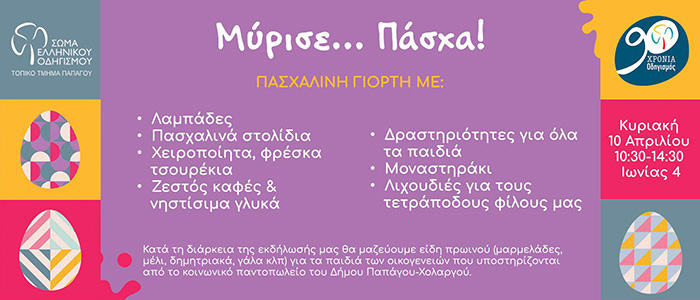 Πασχαλινή Γιορτή οργανώνει αυτή την Κυριακή 10 Απριλίου το Τοπικό Τμήμα Παπάγου του Σώματος Ελληνικού Οδηγισμού στην Εστία του (Ιωνίας 4, Παπάγου).