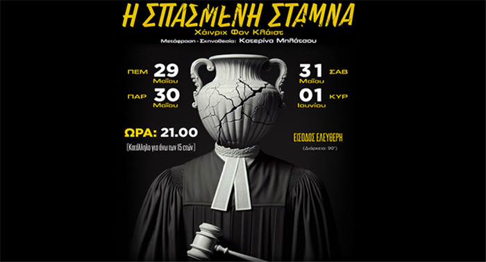 Ολοκληρώνεται και η φετινή επιτυχημένη θεατρική χρονιά για τη Θεατρική Ομάδα του Δήμου Παπάγου Χολαργού με την παράσταση "Η Σπασμένη Στάμνα" του Χάινριχ Φον Κλάιστ σε ένα γεμάτο 4ήμερο τις προσεχείς ημέρες Πέμπτη 29/5, Παρασκευή 30/5, Σάββατο 31/5 & Κυριακή 1/6.