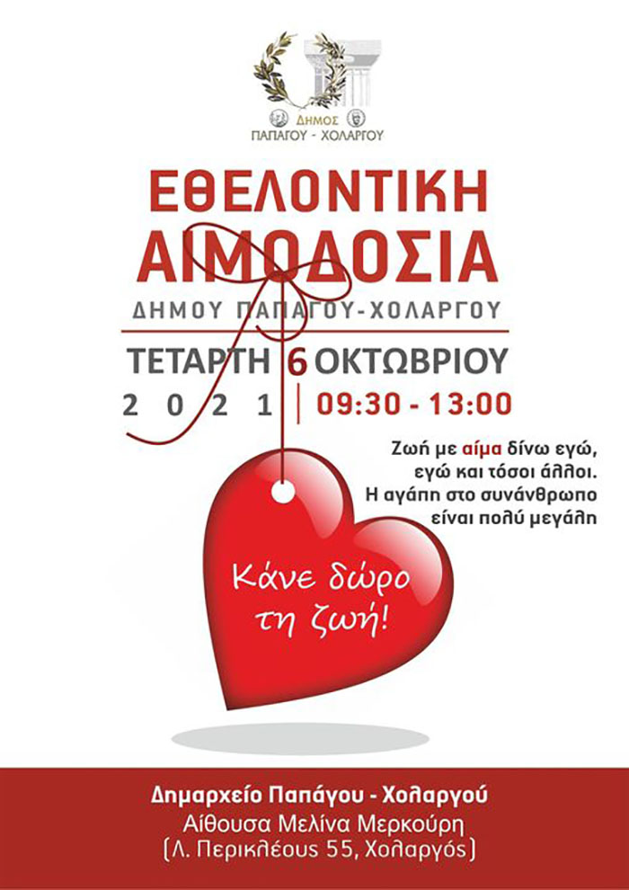 Ο Δήμος Παπάγου - Χολαργού, συνεχίζοντας την προσπάθεια για την κάλυψη των αναγκών σε αίμα, διοργανώνει Εθελοντική Αιμοδοσία την Τετάρτη 6 Οκτωβρίου 2021 στην αίθουσα «Μελίνα Μερκούρη» του Δημαρχείου Παπάγου – Χολαργού (επίπεδο -1, Λ.Περικλέους 55, Χολαργός), κατά τις ώρες 09.30 έως 13.00.