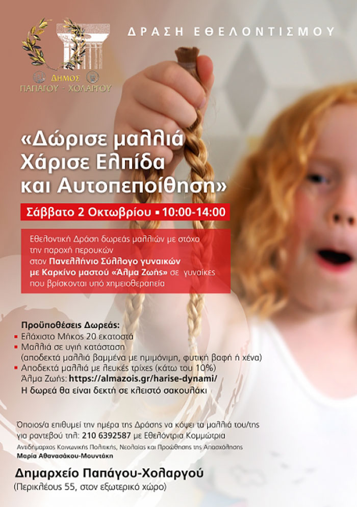 Ο Δήμος Παπάγου – Χολαργού διοργανώνει εθελοντική δράση δωρεάς μαλλιών, με στόχο την παροχή περουκών στον Πανελλήνιο Σύλλογο Γυναικών με καρκίνο μαστού "Άλμα Ζωής", που βρίσκονται υπό χημειοθεραπεία, στον εξωτερικό χώρο του Δημαρχείου Παπάγου – Χολαργού (Λ. Περικλέους 55 Χολαργός), το Σάββατο 2 Οκτωβρίου και ώρες 10:00 έως 14:00.