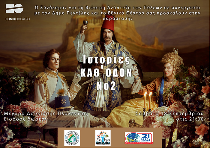 Ο Σύνδεσμος για τη Βιώσιμη Ανάπτυξη των Πόλεων (ΣΒΑΠ) σε συνεργασία με τον Δήμο Πεντέλης και το Εθνικό Θέατρο σας προσκαλούν στην παράσταση «Ιστορίες Καθ’ Οδόν», στο Μέγαρο Δουκίσσης Πλακεντίας. Η θεατρική παράσταση θα παρουσιαστεί το Σάββατο 18 Σεπτεμβρίου, στις 21:00 με δωρεάν είσοδο για τους δημότες.