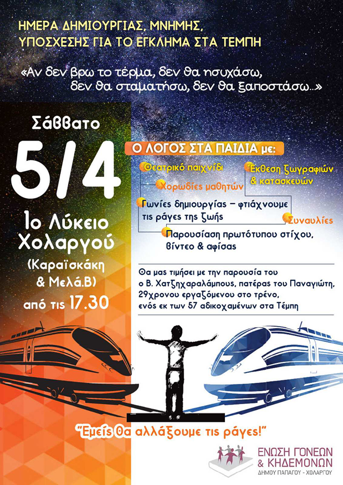 Εκδήλωση για την τραγωδία των Τεμπών διοργανώνει σήμερα Σάββατο (5/4) η Ένωση Συλλόγων Γονέων Παπάγου Χολαργού. Σε μία ημέρα δημιουργίας, μνήμης και υπόσχεσης καλούν όλους οι διοργανωτές με ώρα έναρξης τις 17.30 το απόγευμα και χώρο το 1ο Λύκειο Χολαργού (Καραϊσκάκη και Β. Μελά).