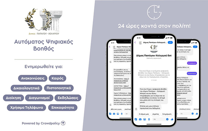 Ο Δήμος Παπάγου - Χολαργού, εγκατέστησε τον αυτόματο ψηφιακό βοηθό - Chatbot, που αποτελεί πρόγραμμα σε υπολογιστές ή κινητές συσκευέςκαιμιμείται την γραπτή επικοινωνία. Χρησιμοποιεί τεχνικές επεξεργασίας φυσικής γλώσσαςκαι τεχνητή νοημοσύνη και μπορεί να απαντάει άμεσα σε ερωτήματα, να δίνει έγκαιρα ποικίλες πληροφορίες, καθώς και να υποστηρίζει διαδραστικές ηλεκτρονικές υπηρεσίες και συναλλαγές.Ο νέος