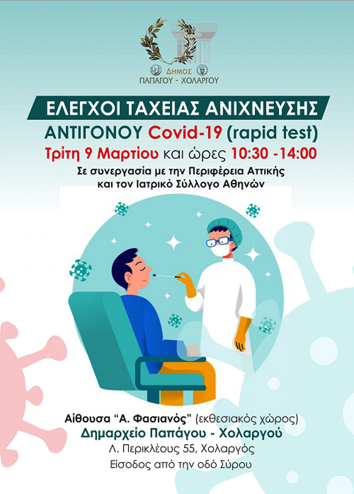 Ο Δήμος Παπάγου – Χολαργού σε συνεργασία με το Κέντρο Επιχειρήσεων της Περιφέρειας Αττικής και τον Ιατρικό Σύλλογο Αθηνών, διοργανώνουν δωρεάν ελέγχους ταχείας ανίχνευσης αντιγόνου Covid-19 (rapid test), την Τρίτη 9 Μαρτίου 2021 και ώρες 10:30 έως 14:00.