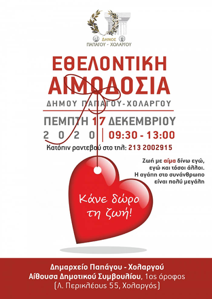 Ο Δήμος Παπάγου Χολαργού, συνεχίζοντας την προσπάθεια για την κάλυψη των αναγκών σε αίμα, διοργανώνει Εθελοντική Αιμοδοσία την Πέμπτη 17 Δεκεμβρίου 2020 στην αίθουσα Δημοτικού Συμβουλίου του Δημαρχείου Παπάγου - Χολαργού, 1ος ορ.-Περικλέους 55, Χολαργός, κατά τις ώρες 09.30 έως 13.00. Η αιμοδοσία διοργανώνεται σε συνεργασία με την κινητή μονάδα του Γενικού